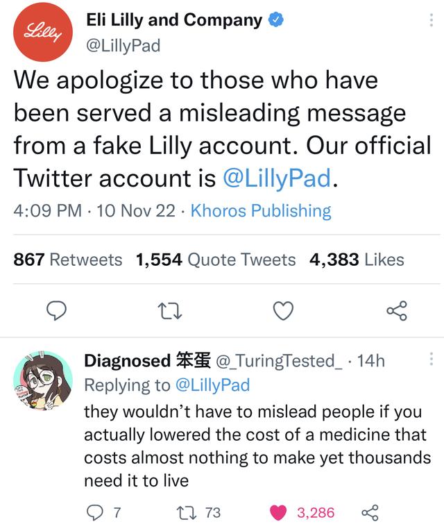 [1] https://www.forbes.com/sites/brucelee/2022/11/12/fake-eli-lilly-twitter-account-claims-insulin-is-free-stock-falls-43/?sh=5f3360ae41a3