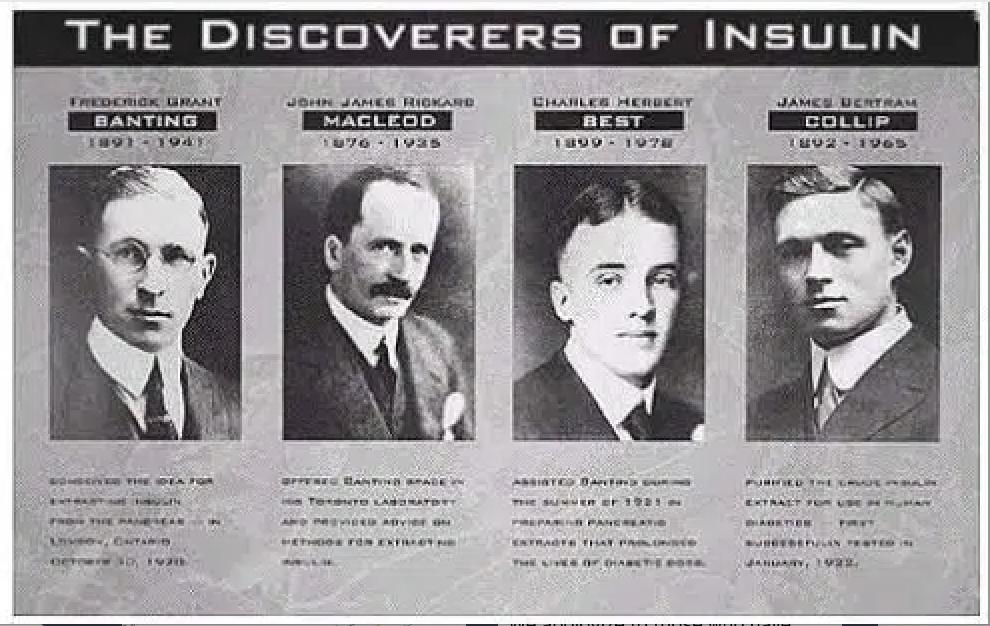 1921年,在加拿大多伦多大学,弗雷德里克·班廷(Frederick Banting)和查尔斯·贝斯特(Charles Best)首次从狗的胰腺中分离出胰岛素,并证明它具有控制血糖和治疗糖尿病的作用。两年后,班廷和实验室主管J.J.R. 麦克劳德(J.J.R. Macleod)教授因为这项发现获得诺贝尔生理学或医学奖。贝斯特因为当时还未毕业,没有获奖,班廷就把自己的一半奖金分给了他 [4]。而麦克劳德也拿出一部分奖金,分给帮助他分离胰岛素的化学家詹姆斯·科利普(James Collip)。