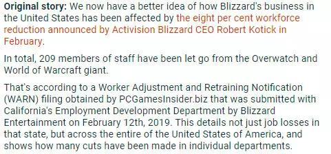 第二点是减少研发预算和裁员。例如在收入保持增长的2019年,动视暴雪依旧宣布裁员8% (约800人) 。随后 PCGamesInsider.biz 获得的美国加州 (WARN) 劳工法案文件资料显示,已有209名暴雪员工已收到遣散通知,其中大部分来自于《守望先锋》和《魔兽世界》项目组。