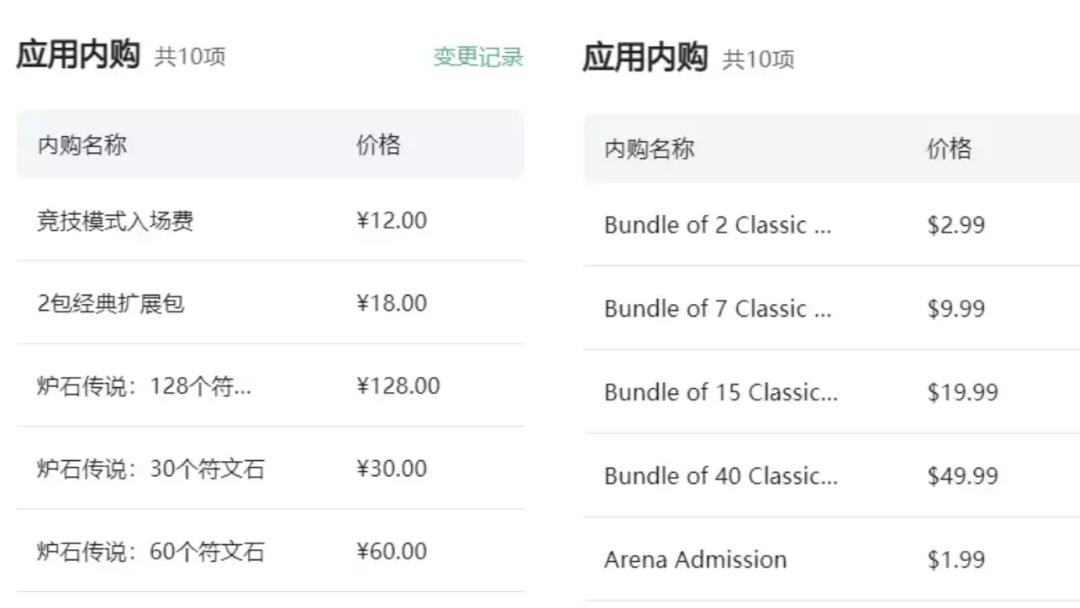 《炉石传说》国服(左)与美服(右)内购定价对比,来源七麦数据