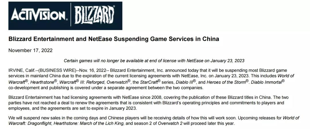 事件最新进展中,动视暴雪表示正在寻求停止合作后的替代方案;网易则已经发布了上述游戏的停运公告,并表示会为玩家服务到最后一刻,尽力保证玩家数据的顺利过渡。