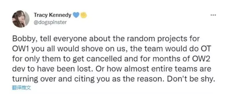 对此,暴雪《守望先锋》制作人Tracy Kennedy发文驳斥这种说法,她表示《守望先锋2》研发进度问题,跟Bobby要求研发的临时项目取消有关,希望他不要把问题推给团队。
