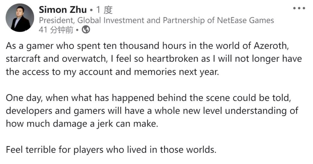 双方宣布终止合作后,网易游戏全球投资及合作总裁朱原称暴雪某人为「混蛋」