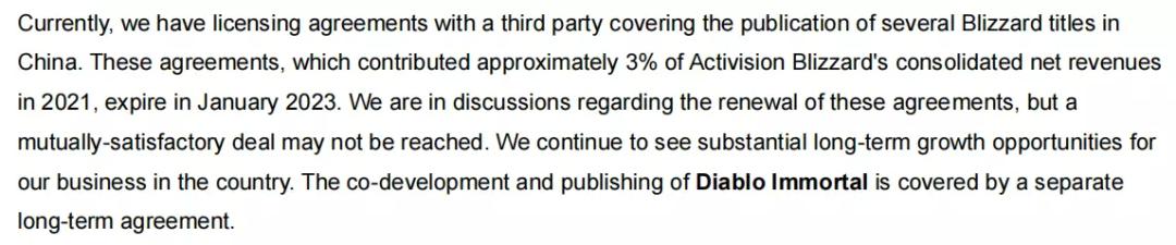 11月初,动视暴雪在第三季度财报中提及,公司正在就续约问题跟网易谈判,但最终可能无法取得让双方满意的结果,并披露中国代理的协议产品仅占2021年占动视暴雪收入的3%。