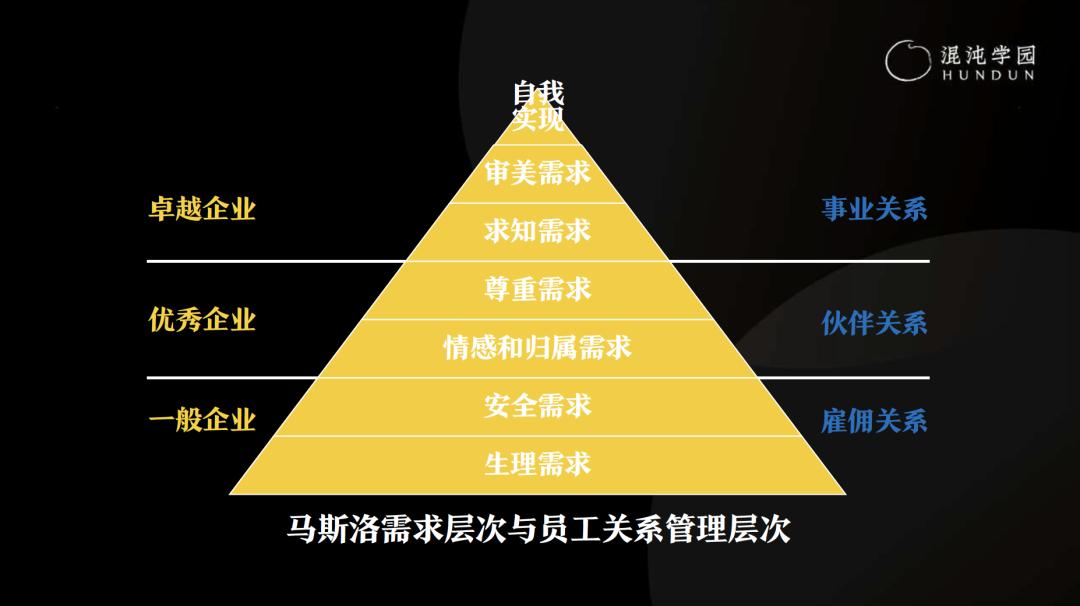 这时候马斯洛需求就再次跟员工管理产生了层次的关系,一般的企业可能就是雇佣关系,只满足员工生理和安全的需求;而优秀的企业会跟员工形成一种伙伴关系,满足员工情感的需求、归属的需求,尊重的需求;而真正卓越的企业是跟员工成为事业共同体、命运共同体,满足员工求知的需求、审美的需求,以及帮助员工自我实现。