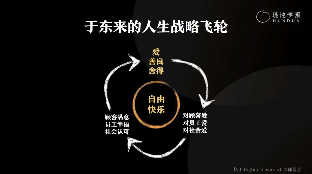 这也是他自己的人生战略飞轮:爱、善良、舍得,进而对顾客爱、对员工爱、对社会爱,他就获得了客户满意、员工幸福、社会认同。形成了自由、快乐的内核,这是于东来个人的人生战略飞轮。