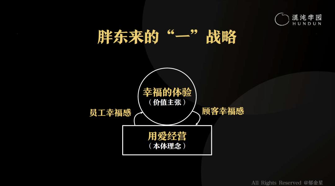 它的反馈是什么?是顾客的幸福感。它的本体理念是用爱经营,那么胖东来的爱首先触及到员工,让员工感受到幸福。接着员工才能把这份幸福的体验传递给顾客,顾客才会获得幸福感。然后形成了用爱经营,这就是它这个阶段“一”战略的闭环。