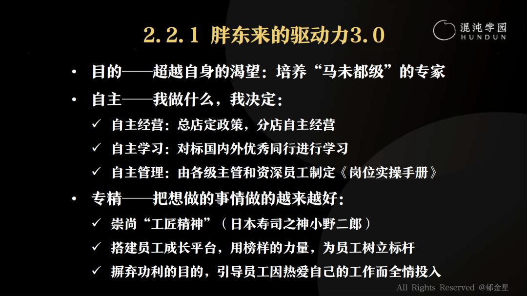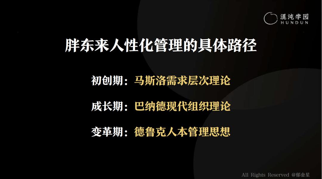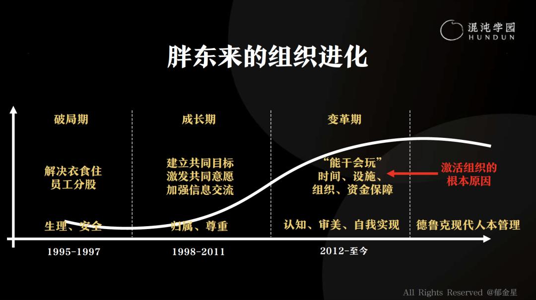 到了变革期,在德鲁克人本思想的基础上,于东来创造性地提出了“能干会玩”。并且在时间、设施、组织、资金上面提供了保障,设置了一整套的制度。这时候帮助员工提升的是认知、审美和自我实现,这也才是胖动来真正激活组织的根本原因。