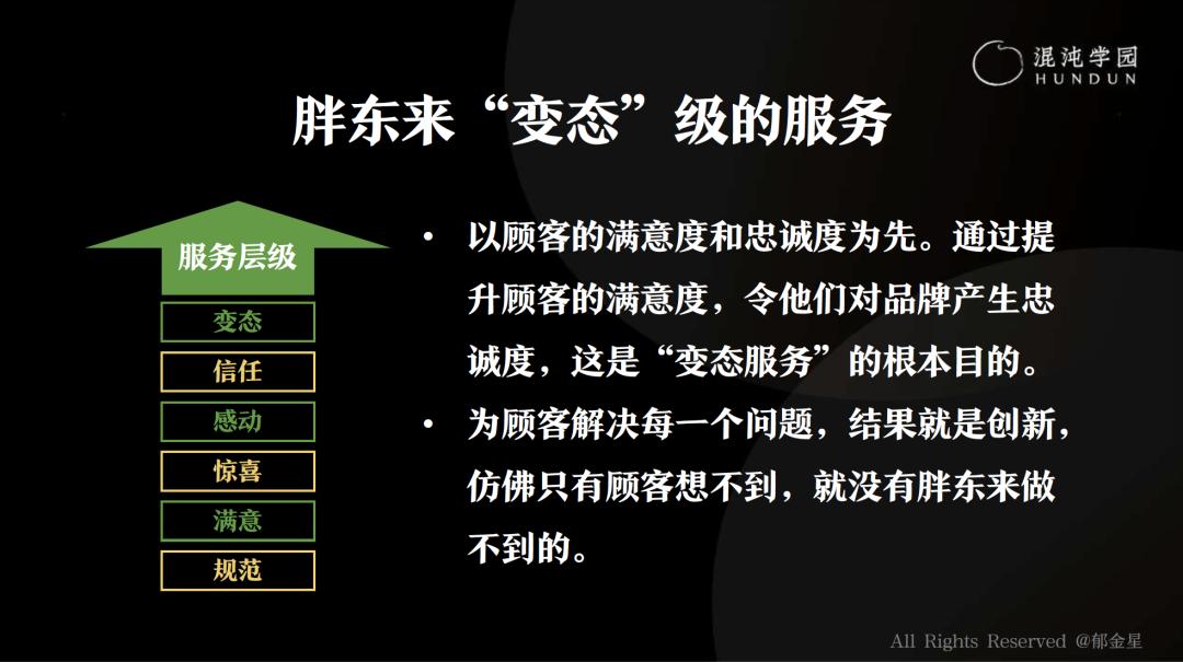 再比如,于东来给新店选址,还会按照自己的经营水准去考核周边的酒店、餐饮等等业态。要是觉得人家服务不到位,他还会派出胖东来的团队去给人家培训,来把整个社区的服务水准拉齐。