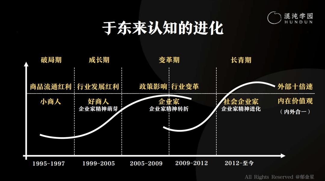 2012年至今十多年过去了,他已经进化成一个社会企业家。企业家精神的进化,这是于东来在认知层面的进化,随着外部十倍速和内在价值观的内外合一,让自己的企业也发生了不断的进化。
