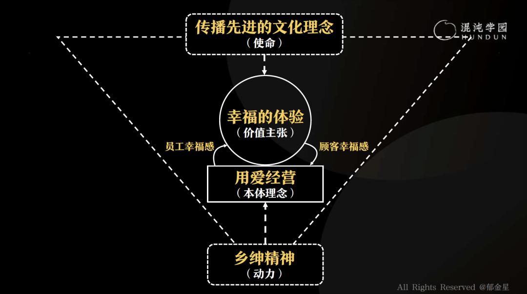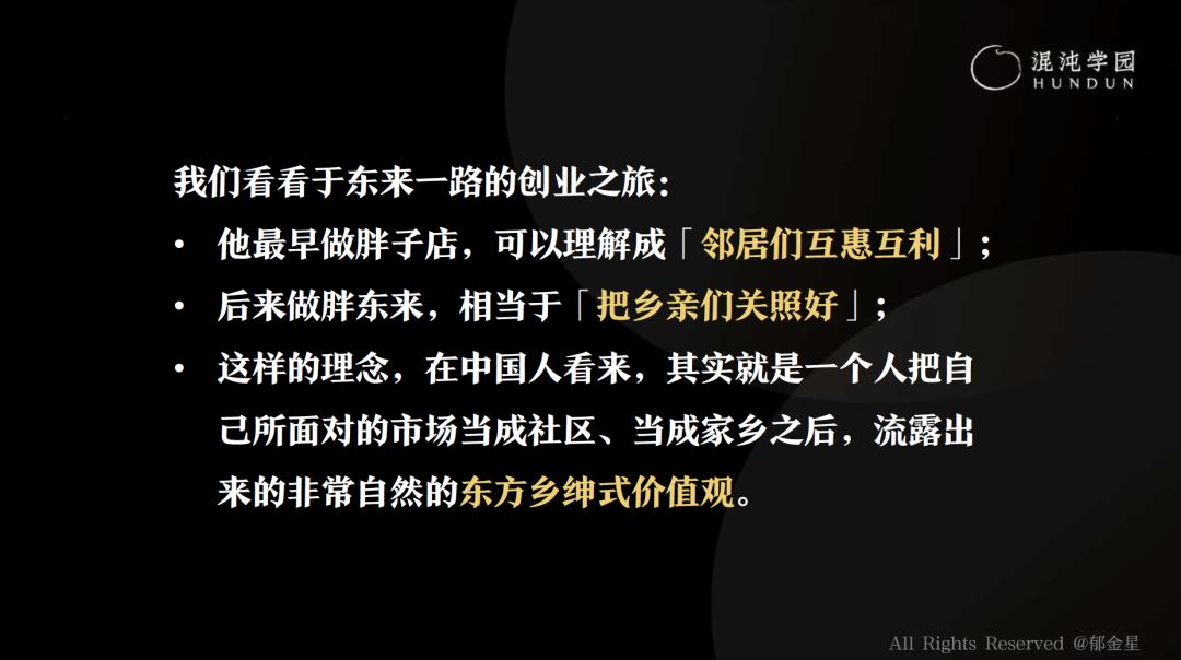 这种新乡绅精神,其实是源于于东来看到自己内心自主性的根源,他用这种心力去给员工尊重和快乐,进而能够关爱客户,关爱社区。所以于东来是用胖东来作为载体,实现了企业从经营到文化构成的完整价值,所以在这里可以看到他的核心动力是他的乡绅精神。
