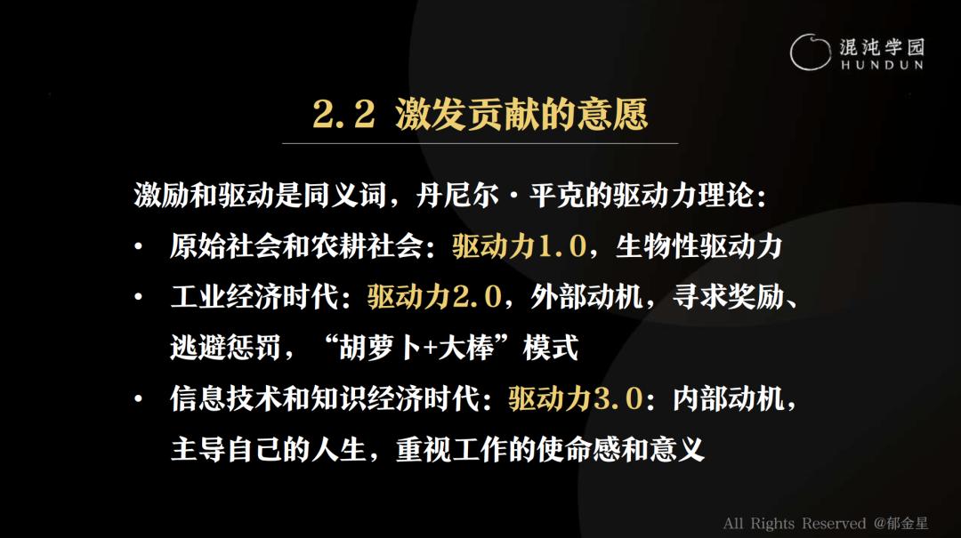 第二条就是激发贡献的意愿,丹尼尔·平克在《驱动力理论》里讲过驱动力,原始社会农耕社会的驱动力是1.0,是靠生物性驱动的;在工业经济时代,驱动力2.0是追求外部动机、寻求奖励、逃避惩罚,叫“胡萝卜+大棒”的模式。但是到了信息技术和知识经济的时代,我们要用驱动力3.0充分调动员工的内部动机去主导自己的人生,重视工作的使命感和意义。