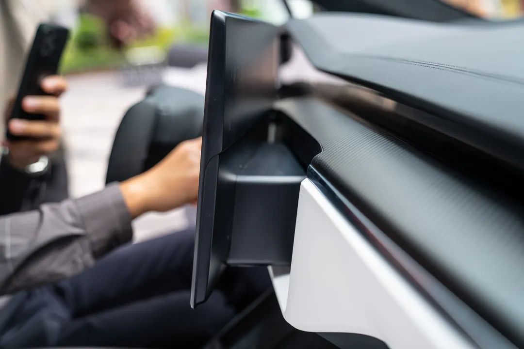 为了便于前排乘员操作,17 寸中控屏幕不再是固定的,而是变成了“向日葵屏”,可以分别向左右各转 10°,让双方视野都更好。屏幕由背后的转动机构驱动,动作很轻柔。