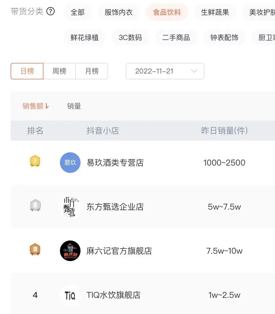 麻六记官方旗舰店昨天在抖音小店,食品分类排行榜爬到了第三名(图源自蝉妈妈)