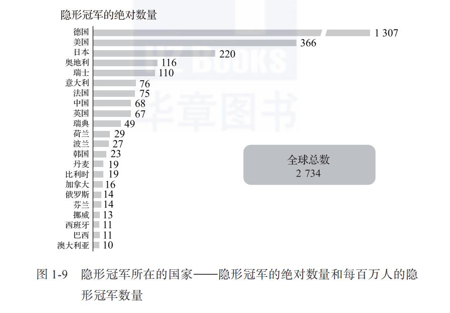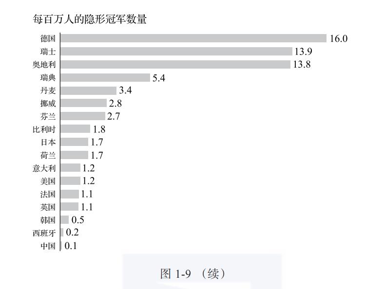 此处需要提醒的是,对于图1-9中给出的数据应该谨慎解读。毫无疑问,我们收集到的德国和德语区的隐形冠军名单比其他国家的完整。但是应当指出的是,许多其他国家的研究者也都或多或少系统地收集了隐形冠军的名单20。所以,我们仍然可以认为这里给出的数据大体上是准确的,即使再继续深入地收集也不会改变判断的基本依据。这些数据支持了前面所总结的德国出色且持久的出口能力归因于隐形冠军的结论。