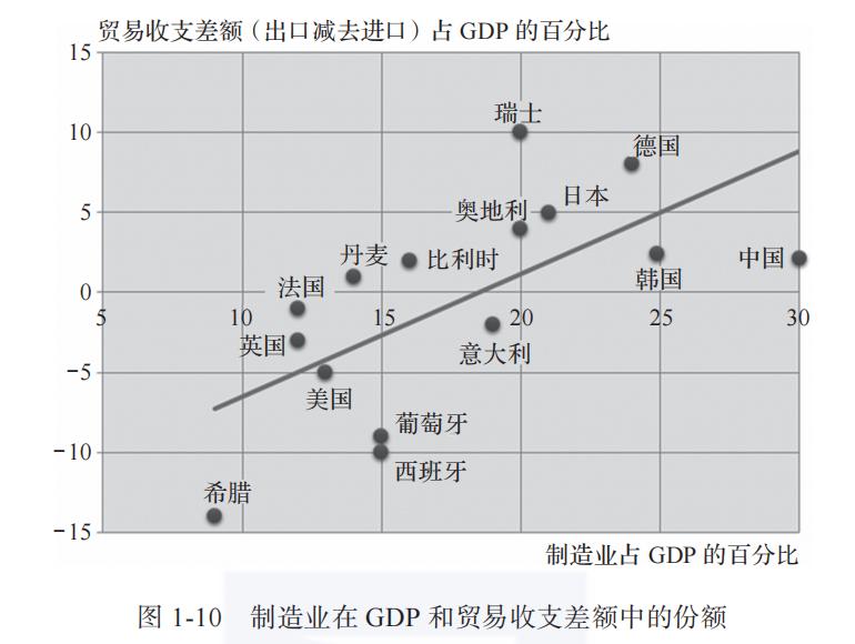 事实上,强大的制造业是出口成功的重要基础。图1-10显示了所谓的贸易收支差额与制造业占GDP比重之间的关系24。贸易收支差额显示一个国家有多少贸易顺差。