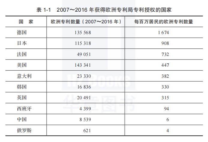我们想就欧洲专利局2007~2016年10年间的专利授权量对德国出色的创新能力进行阐述和讨论。在欧洲专利局递交的专利申请量可以被看作最有代表性地反映了国际专利运营的水平。虽然专利只是构成国家创新力的一部分,但是仍可窥一斑而见全豹。表1-1显示了10年间欧洲专利局授予专利权的国家。