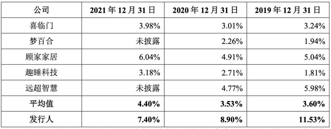 根据招股书显示,2019-2021年,慕思的纯广告费用分别为4.45亿元、3.96亿元和4.8亿元,其广告费用率也远高于同期其他同类品牌。