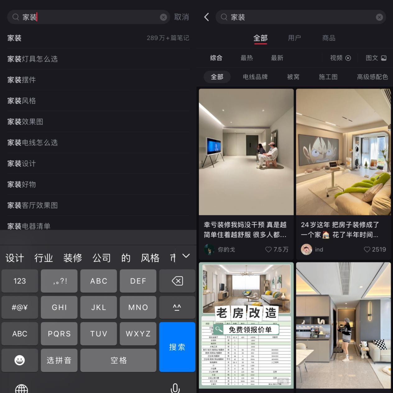 在小红书上,房间改造、旧屋翻新、氛围感小屋打造、卧室布置,与关键词家装相关的笔记高达289万+篇。