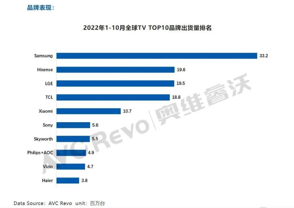 经Morketing核实发现,行业研究机构奥维睿沃此前发布的数据报告中,海信全球TV出货量达1960万台,的确仅次于三星,位于世界第二,这也是中国电视品牌年累出货量首次进入全球第二。
