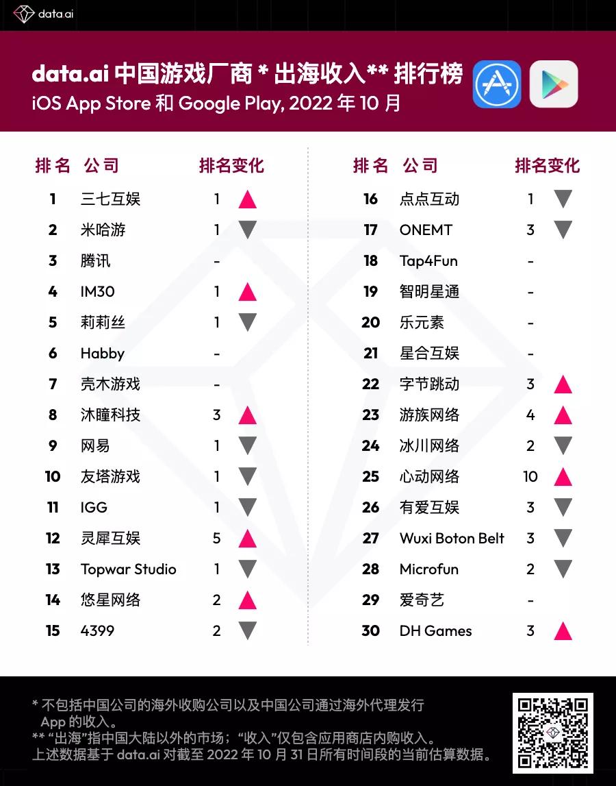 近日,数据机构 data.ai 公布中国游戏厂商 10 月出海收入,三七互娱首次超过米哈游、腾讯成为榜首。在此之前 3 个月,榜首分别为米哈游、网易、腾讯。几乎与此同时,暴雪娱乐公司宣布与网易的现有授权合约即将到期,中国大陆将暂停多数游戏服务。而在 11 月 2 日最新发布的《中国互联网企业综合实力指数报告》中,米哈游也超过网易,排名第三。