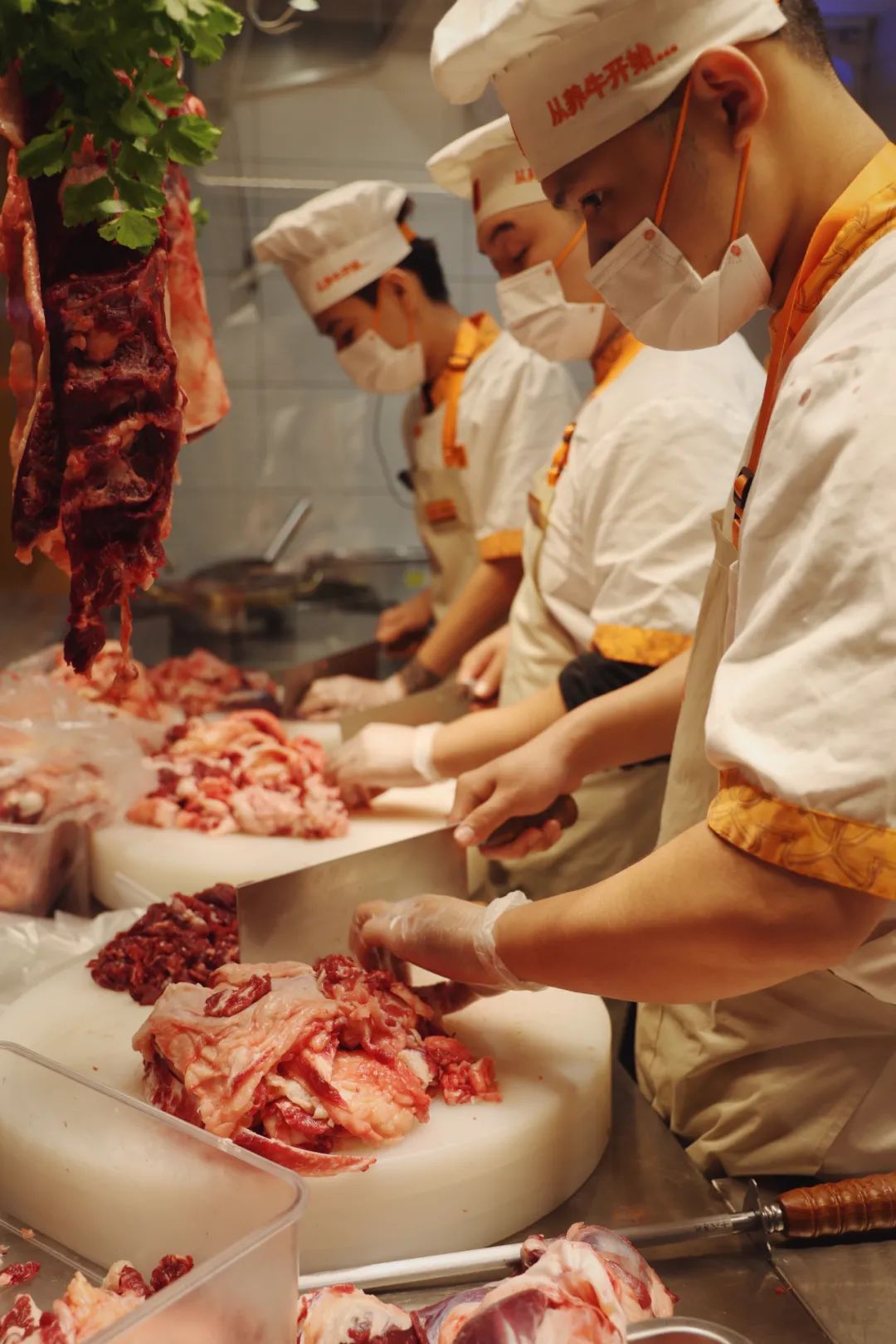 △潮发牛肉火锅店后厨,工作人员正在切肉。