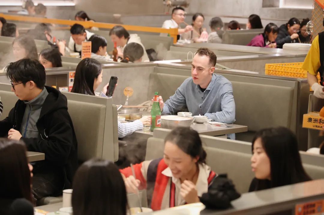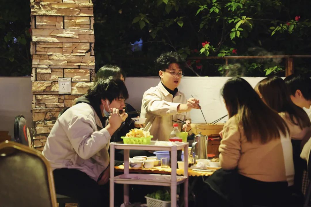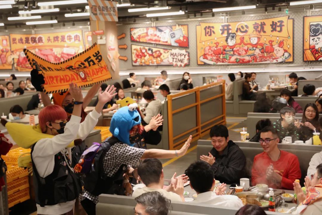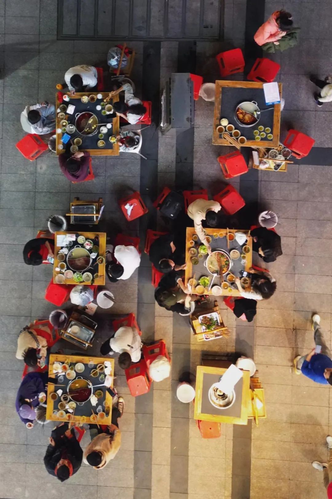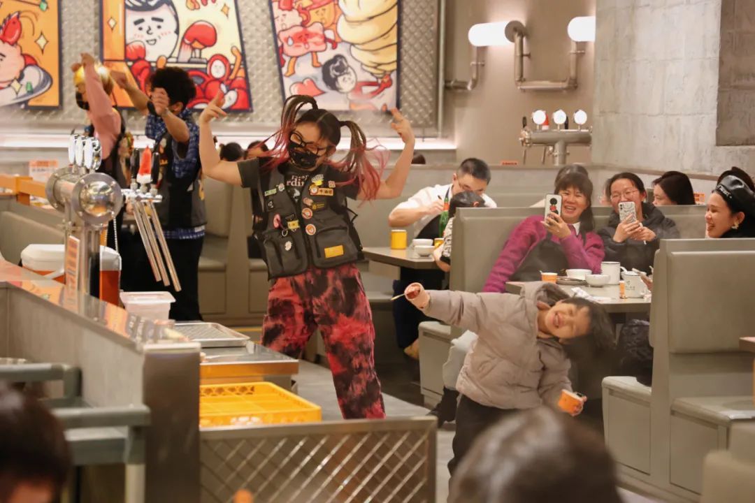 △晚上8点,整个店开始躁动起来,全部员工跳起热舞。食客拍照分享至社交平台,打卡氛围感十足的火锅店。