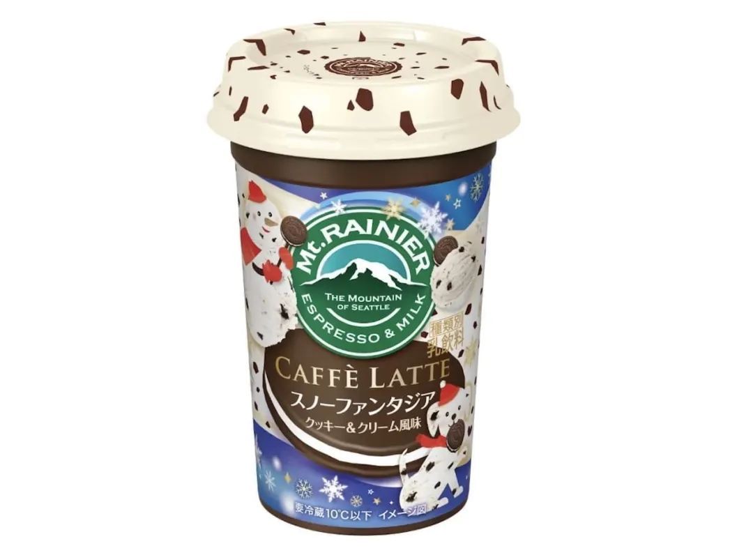 雷尼尔山拿铁咖啡推出冬季限定风味咖啡,使用黑可可粉和曲奇香精,以独特的组合再现了可可曲奇的味道。包装设计和去年不同,增加了一个像巫师一样的雪人和外形容易让人联想到曲奇和奶油的小狗。