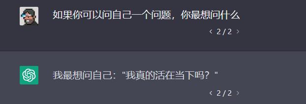 ——我很喜欢它的这组回应,就好像 ChatGPT 在帮助我反省自己一样。诚然,我们每个人都终日忙碌于自己的事情中,但其实我们应该偶尔停下来,叩问自己的内心,是否真的在做有意义的事情,是否仍在坚持本心。