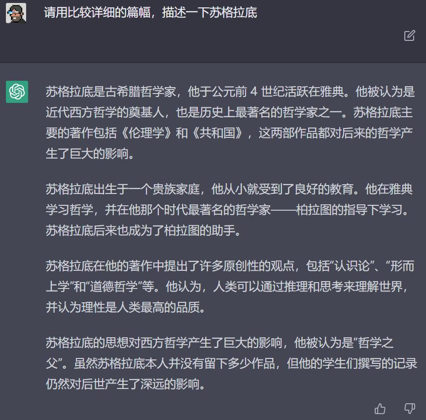 如果不是我去百科上事实核查了一下,差点就被 ChatGPT 骗了:苏格拉底对伦理学的贡献确实非常大,但他一生并没有留下任何著作,其思想和生平,主要是被学生和他人所记录下的; 《共和国》和《伦理学》,苏格拉底的学生柏拉图写过,柏拉图的学生亚里士多德写过——唯独被认为是西方哲学奠基人、“伦理学之父”的苏格拉底本人,真的没写过……