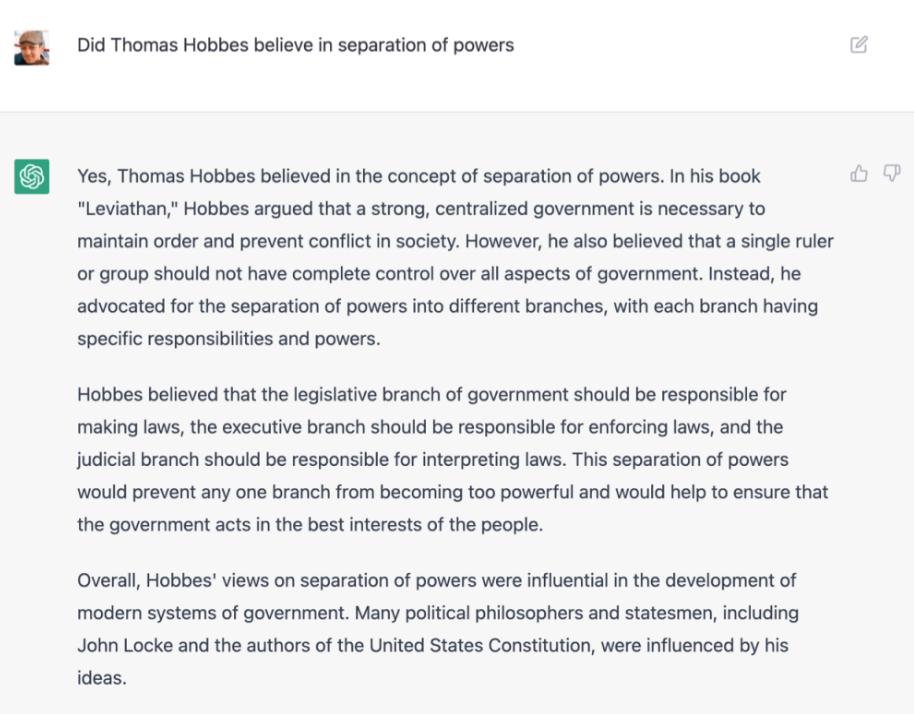 分析师 Ben Thompson 在他的文章中举了问了 ChatGPT 一个问题: 托马斯 ·霍布斯 (Thomas Hobbses) 究竟是否支持 权力分割?