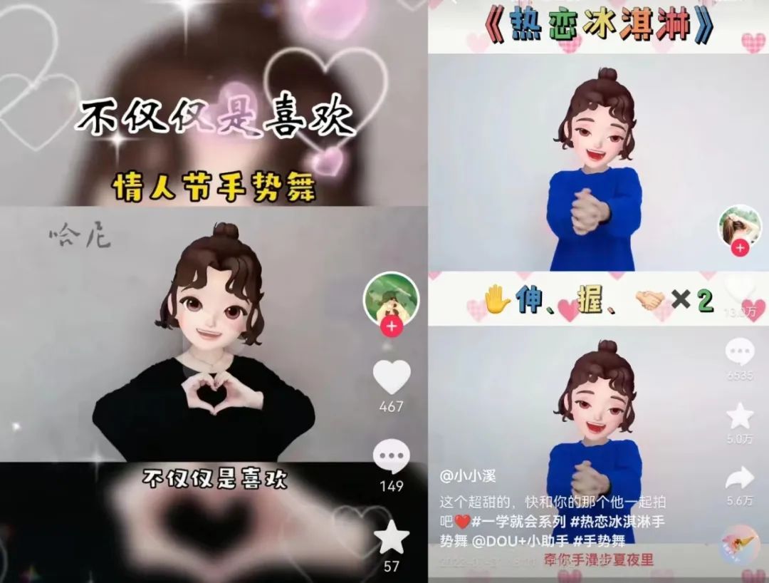 以手作为重要表演“工具”的手势舞自然具备了表情达意的功能,因此这类短视频也具有更强的感染力和吸引力,同时这意味着它可以与热门的话题和社会事件相结合,形成“手势舞+”的互动宇宙,满足用户情感互动的需求。相对于直接的口语表达,手势舞的情感流露得也更加含蓄和具有亲和力。