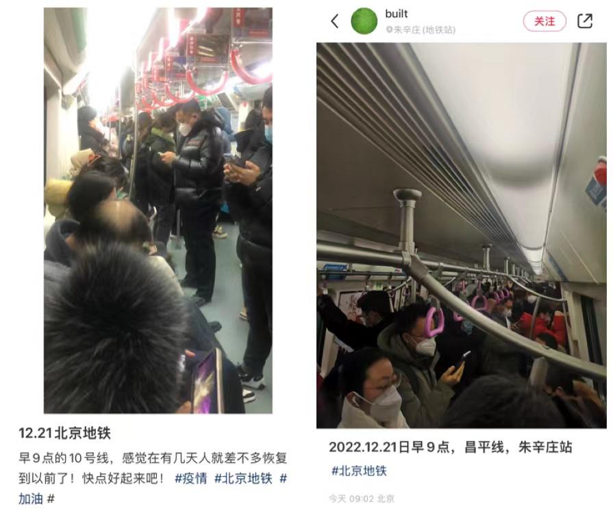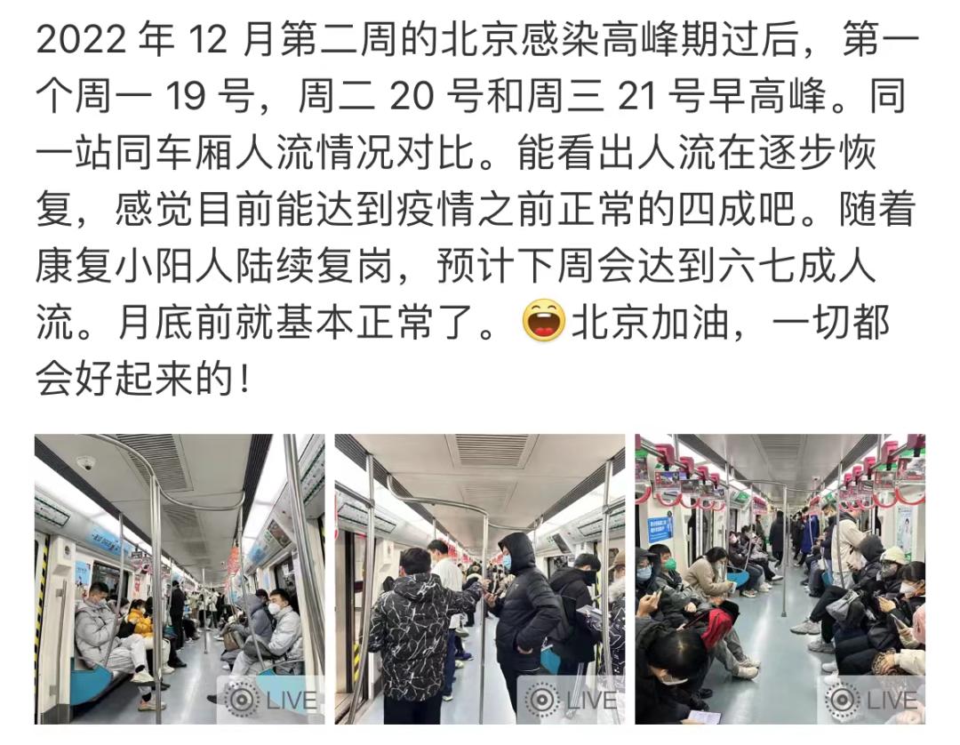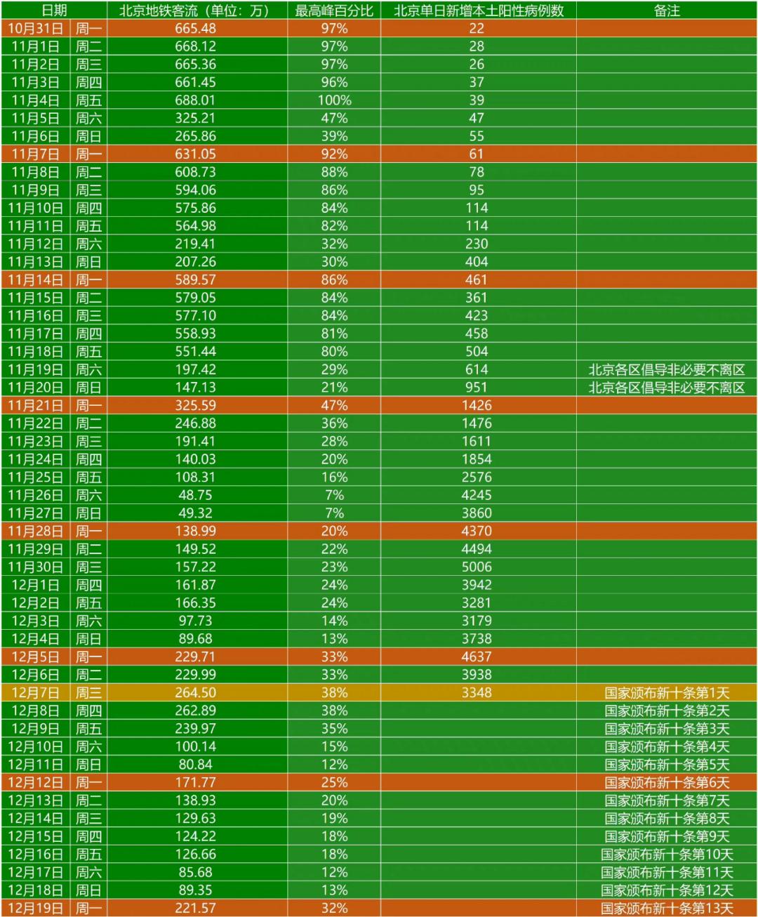 北京市轨道交通指挥中心数据显示,12月3日,北京第一波疫情开始时,周末的客流不到100万,相比之前平均500万左右大幅减少。