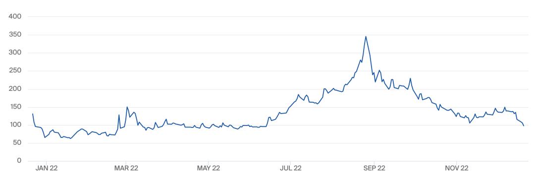 在过去十年,欧洲天然气价格在5欧元/兆瓦时到35欧元/兆瓦时之间波动。但2022年,欧洲气价飙升,在8月下旬俄罗斯威胁断气时,TTF月前期货价格一度达到创纪录的346欧元/兆瓦时。在俄乌冲突开启之后,欧洲TTF月前期货价格全年绝大部分时间都在100欧元/兆瓦时以上。