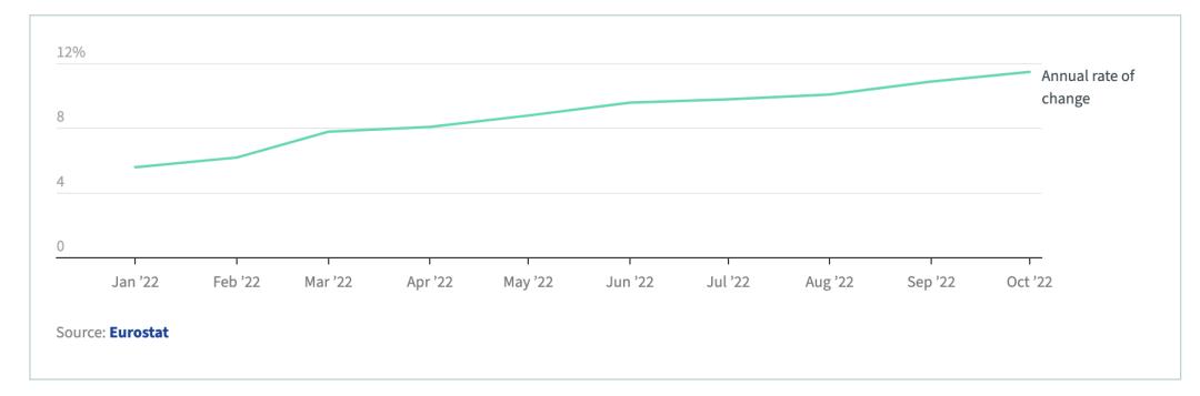 天然气价格的飙升,以及欧洲核电、水电出力不足,导致气电在许多时候成为欧洲电力市场的边际机组,从而也带动了欧洲电价的上涨。以气价上涨为主的能源价格上涨,导致欧洲通胀率不断攀升,从2022年1月的5.6%上涨到2022年10月的11.5%。