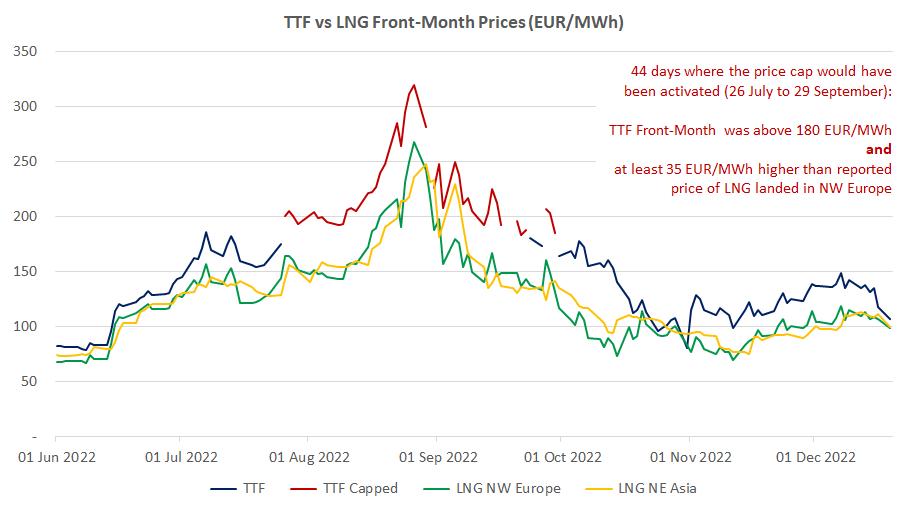 牛津能源研究所分析师Jack Sharples以西欧LNG到岸价作为参考价格,与TTF月前期货价进行回溯对比,结果显示,在7月26日至9月29日的欧洲TTF价格高涨期间,有44天会触发价格上限,即同时满足TTF价格高于180欧元/兆瓦时,并且高于西欧LNG到岸价35欧元/兆瓦时以上。