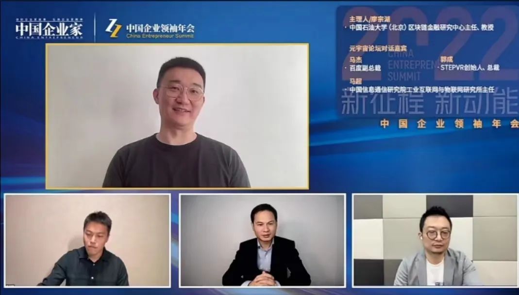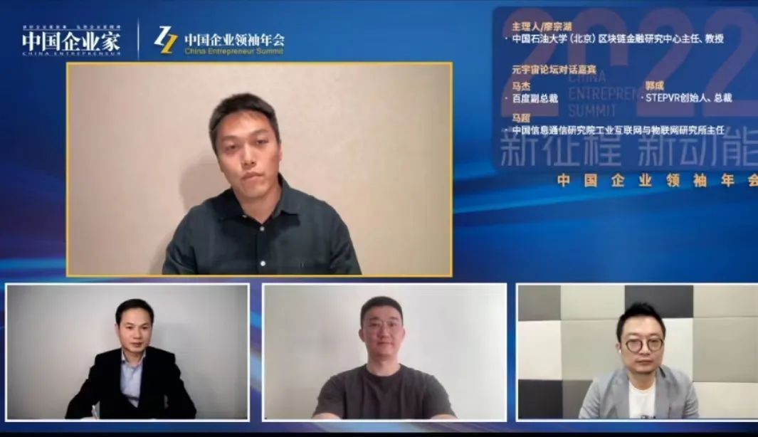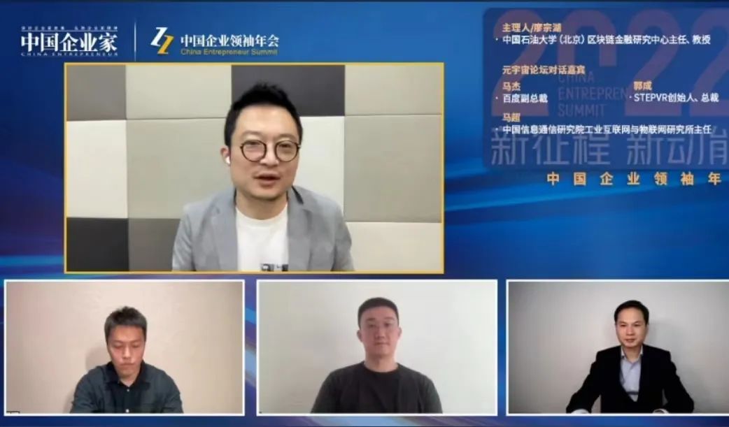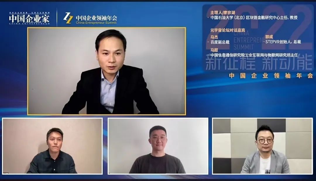 12月10日~11日,由《中国企业家》杂志社主办的“第二十届中国企业领袖年会暨第二十二届中国企业未来之星年会”隆重举行。在以“元宇宙:虚实之间”为主题的元宇宙论坛环节中,中国石油大学(北京)区块链金融研究中心主任、教授廖宗湖作为主持人,与百度副总裁马杰、STEPVR创始人、总裁郭成、中国信息通信研究院工业互联网与物联网研究所主任马超,就更具象的元宇宙做了交流。