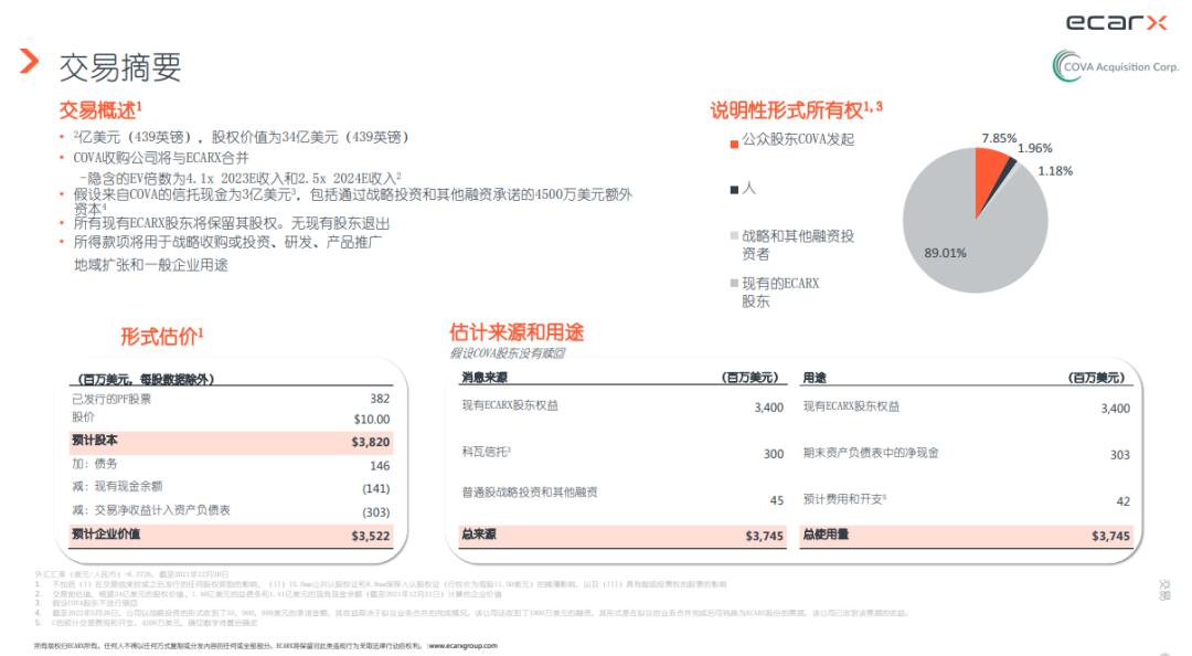 按照协议,该交易合并后,亿咖通的预估股权价值约为38.2亿美元,其中包括COVA以信托形式持有的3亿美元现金、来自战略投资者吉利控股集团、Luminar以及可转换票据持有人路特斯科技(Lotus Technology)的4500万美元额外融资。