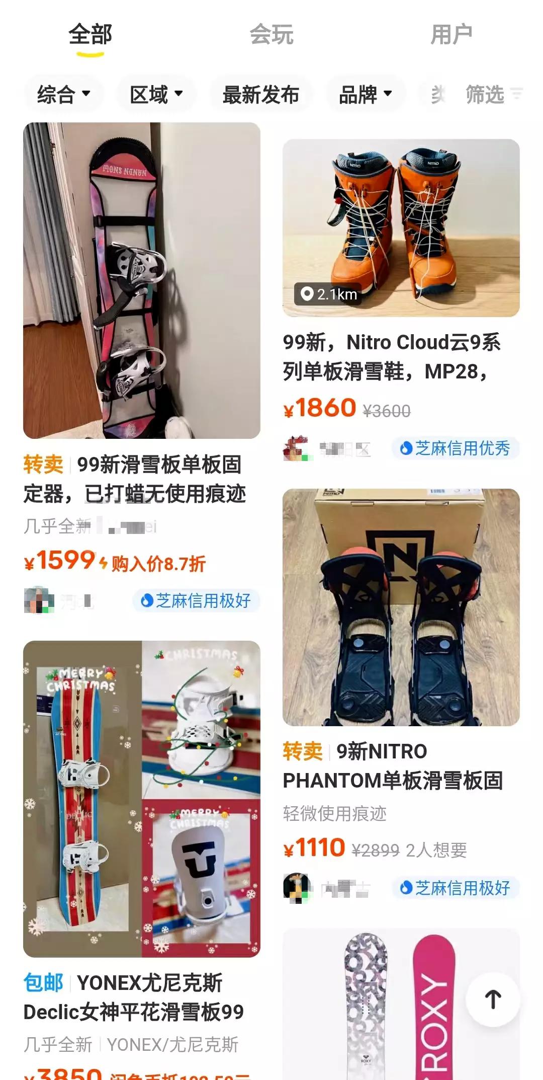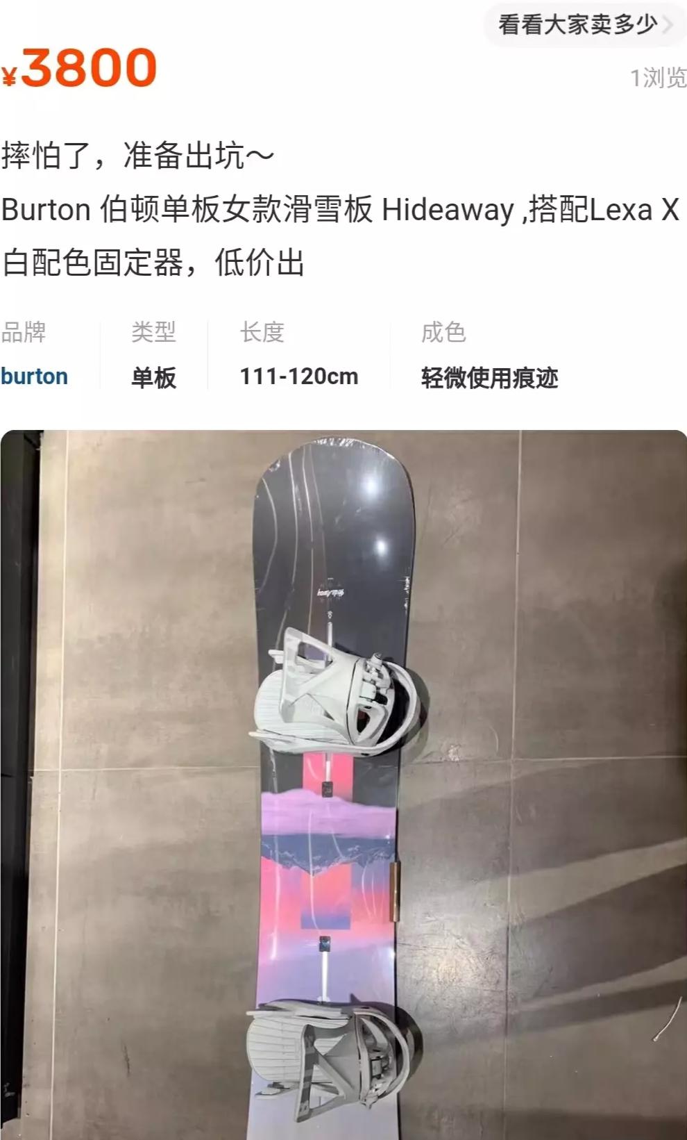 与此同时,燃次元观察到,在二手交易平台上,“99新滑雪板”也占据了一席之地。“上雪一两次”“无瑕疵”和“轻微使用痕迹”等成为这些商品描述的关键词,而出手原因则集中在“学不会”、“骨折弃坑”、“为上镜败家”和“冲动消费”等。