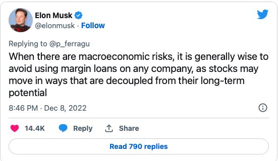 尽管银行财团希望调整贷款结构,但马斯克还是拒绝了保证金贷款的计划。他有着自己的考虑。12月初,马斯克公开在推特上写道,“当存在宏观经济风险时,应该避免使用保证金贷款,因为股票走势可能会偏离长期潜力趋势”。