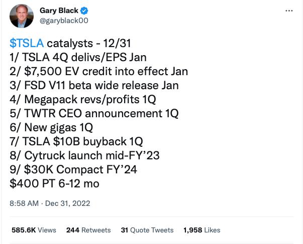 在为马斯克辟谣之后,特斯拉投资者布莱克在岁末最后一天,在推特上列出了他希望看到能够提振特斯拉股价的几大利好数据或者因素。除了特斯拉第四季度交付和工厂产量数据之外,布莱克再次呼吁,希望特斯拉董事会在第一季度宣布回购100亿美元股票,推特宣布新的CEO人选,以便让马斯克回归特斯拉。布莱克希望特斯拉股价在2023年能从目前的123美元重回400美元价位。
