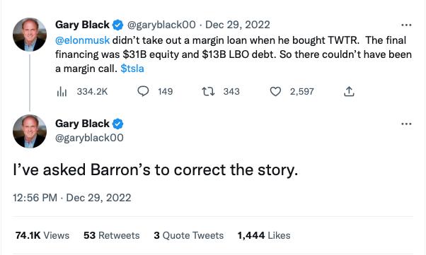 马斯克真到了追加保证金的地步吗?他自己并没有对此公开作出回应。但特斯拉的投资者们看不过去了。长期看涨特斯拉的Future Fund董事总经理加里·布莱克(Gary Black)站出来替马斯克澄清。他转发《巴伦周刊》这则报道辟谣称,马斯克并没有用保证金贷款融资收购推特,因此也不存在追加担保的问题。