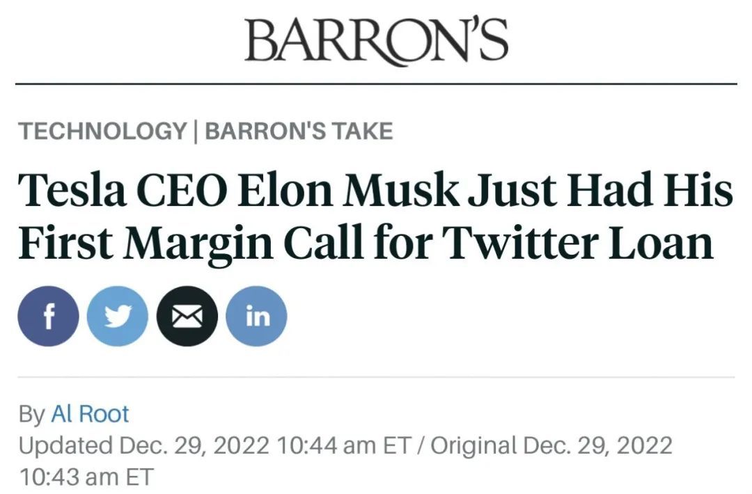 美国知名商业杂志《巴伦周刊》上周四刊文称,随着特斯拉股价大幅下跌,马斯克触及了保证金贷款的补仓警戒线。因为他此前用自己所持的特斯拉股权作为抵押,从银行财团贷款用于收购推特。而随着特斯拉股价大跌,他抵押的股权价值也大幅缩水,因此需要向银行追加保证金。