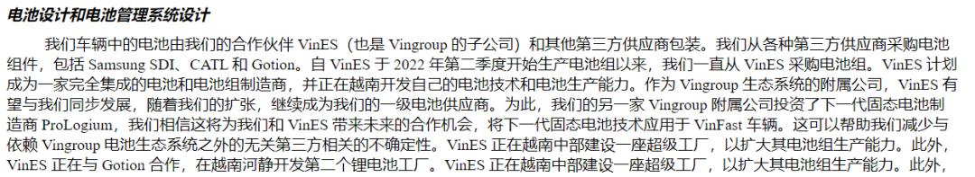 就说电池吧,从今年二季度开始,VinFast 都是从 Vingroup 的另一家子公司 VinES 那儿采购电池,这个自家的 VinES 再拉了三家供应商合作,分别是三星、宁德时代、国轩高科,所以现在 VinFast 车上电池实际上是这三家供应的。