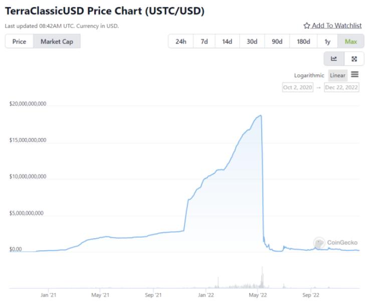 5 月 7 日,LUNA 稳定币 UST 脱锚在推特上掀起一阵 FUD。然而,Terra 创始人 Do Kwon 并没有当回事,因为关于 UST 脱锚的问题已经被讨论无数次。尽管 Do Kwon 以及 Luna Foundation Guard(LFG)在后来采取了挽救措施,然而并未阻止这次脱钩事件演变成一场令人震惊的巨大灾难。从 5 月 8 日至 14 日,LUNA 代币的价格从大约 70 美元跌至 0.000000999967 美元。UST 的市值从 187 亿美元跌至 14 亿美元。
