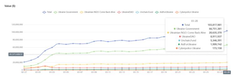据慢雾(SlowMist)统计数据显示,截至 3 月 28 日,乌克兰政府官方地址收到的加密货币捐赠超过 6675 万美元,政府和非政府组织累计收到的加密捐款超过 1 亿美元。