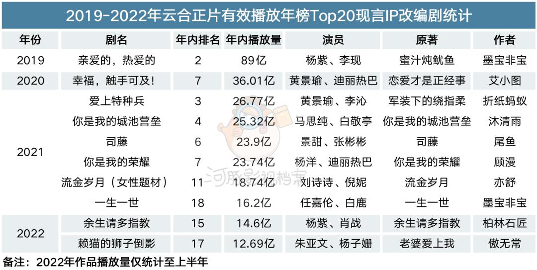 再看到近4年云合正有效播放年榜中的现言剧,不难看出演员对播放成绩的加持。即使是顾漫的《你是我的荣耀》,在不能台网联动的前提下,也依靠了杨洋、迪丽热巴双顶流的话题保障;《司藤》播出前期热度,也有很多是依靠