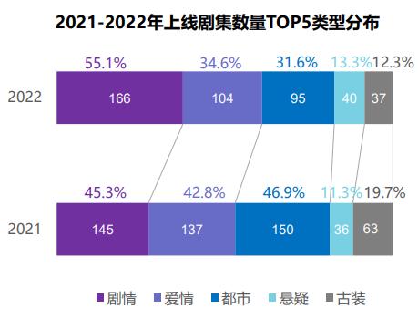 从年度数据来看,根据艺恩数据发布的2022年大剧年度市场研究报告显示,2022年剧集上线数量继续呈下降趋势,上线数量比去年减少18部;播出剧集Top5的类型中爱情类目的剧集数量由137部减少至104部,都市类目剧集由150部下降至95部。