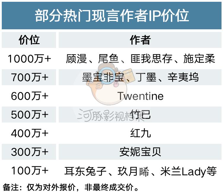 金影科技&诸神联盟影业总裁王晶(锦文)向河豚君描述,现在可以看到影视版权比较抢手的IP作者里已经越来越多新一代作者,比如竹已、耳东兔子、应橙、叶斐然、红九、长洱等,上一代中生代作者则有顾漫、匪我思存、施定柔、辛夷坞等。
