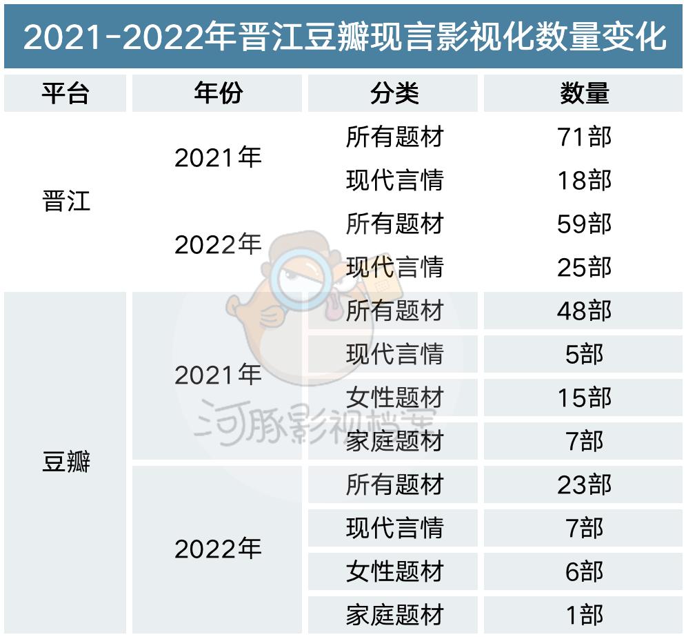 最后再从影视产业链源头的IP端观察,女频IP重要平台晋江和豆瓣,2022年度售出影视版权的总量也由2021年的119部滑落至82部。